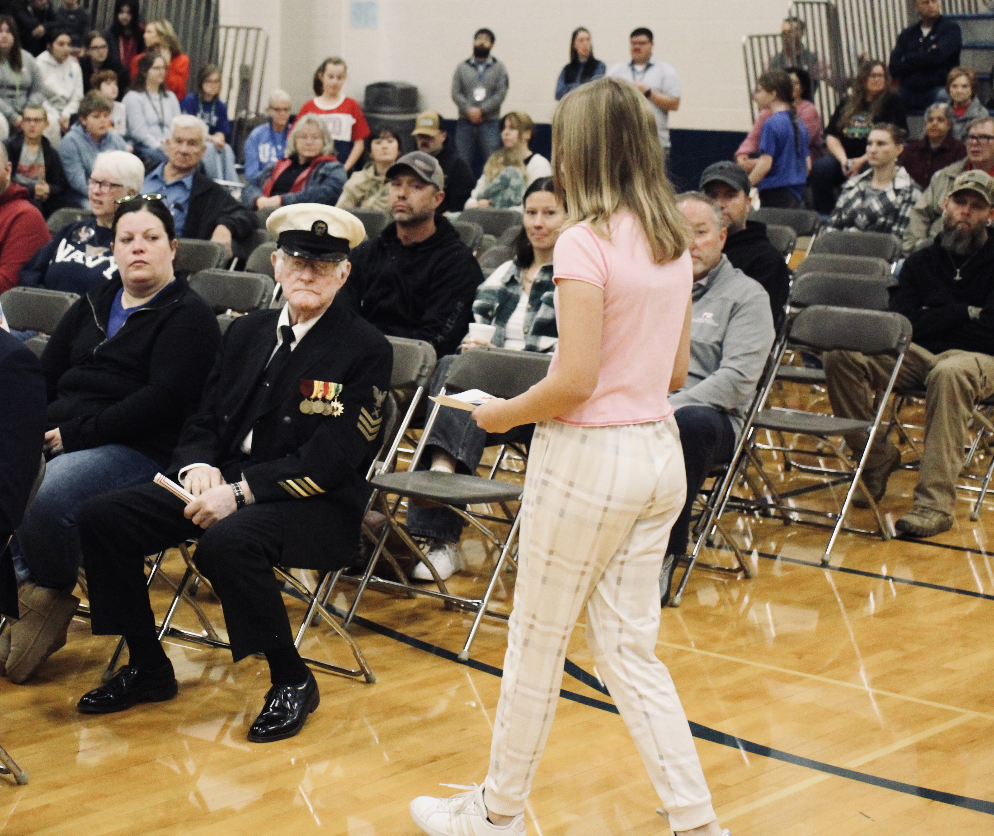 One of the morning’s most heartwarming moments came as members of the Student Council escorted veterans to their seats before and after the program. Near the end of the program, the kids presented handmade cards to the veterans in attendance.